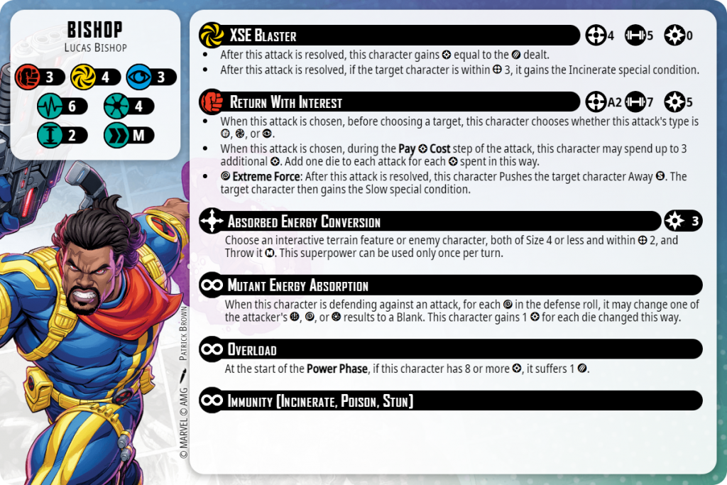 Card art credit Patrick Brown, copyright Marvel and copyright AMGHis competitiveness notwithstanding, AMG has done another great job of translating a comic character to the game of Marvel Crisis Protocol. Bishop gains power by absorbing energy when attacked, and it increases his resilience by changing attack dice to blanks. Additionally, his ability to choose what type of attack he is doing when he uses his Return With Interest spender attack is a really good in-game representation of how BIshop can absorb all different types of energy and then redirect it back at his opponents. As a player, he probably won’t find his way into many of my squads, because I am just not a fan of being punished for having large amounts of power on a character, especially when it’s paired with attacks and superpowers that require a pretty big power investment to begin with. His Overload superpower is very accurate, but I think it’s going to keep him off a lot of tables. Have any other recommended readings for Bishop? Strategies for playing him? Let us know below!