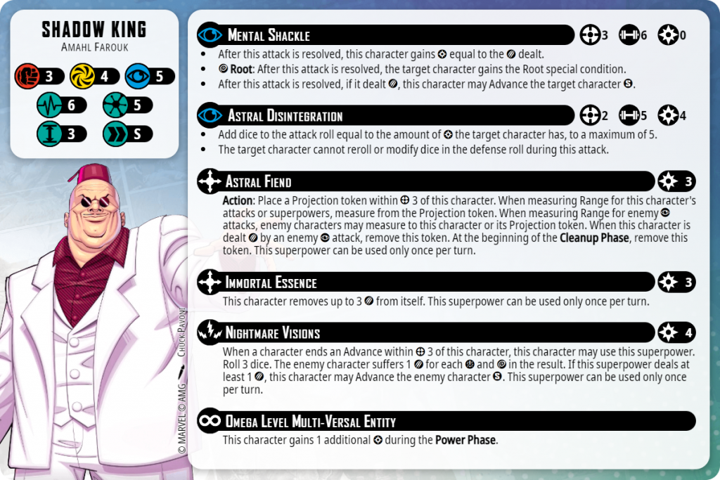 Copyright Marvel and AMGIn this case, yes and no. The model itself is an amazing sculpt, and one of the best that AMG has created. It’s also very thematic that all of his attacks are Mystic. He is an evil psychic entity, after all. I also think it’s a really good representation of the character that he is a 5-threat and gains an additional power during the Power Phase. However, while the character may be worthy of a 5-threat cost, I’m not entirely sure that his powers and abilities warrant that. For one, he’s only got six stamina, and with a physical defense of 3, all it takes is a couple of strong punches to the face, and Mr. Farouk is getting dazed. Additionally, his Astral Projection ability is incredibly thematic, but it doesn’t really send his power through the roof. Yes, you can measure ranges from it, but any opponent with a Mystic attack is going to do the same and remove it. It also costs as much power as his heal, Immortal Essence, which means you are usually choosing between one or the other. Astral Disintegration looks good on the surface, but it only has a Range of 2, which also means he is in range of most physical attacks in the game. And he does not like getting punched. Did I get it wrong? Are his abilities and powers accurate to his power level in the comics? Let us know what you think in the comments below!
