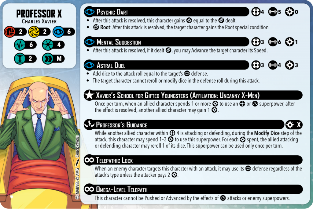 Professor’s Guidance is a major source of support for the team built around Professor X. Once per turn, if an allied character is within Range 4 and attacking or defending, Xavier can spend 1-3 power during the modify dice step of the attack to let them roll 1-3 dice, one for each power spent. This not only helps everyone smooth out their dice rolls, it also activates Xavier’s leadership, letting you put a power on someone who can use it.