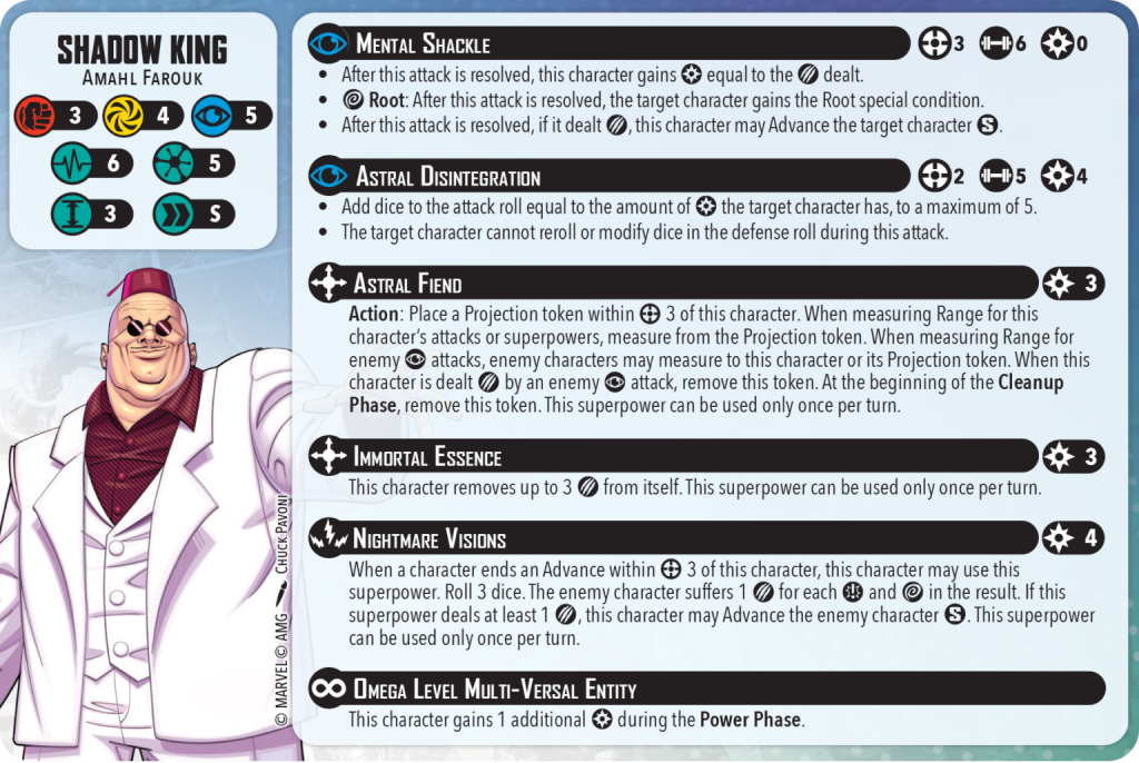 Shadow King Character Card – courtesy of Atomic Mass GamesShadow King’s basic stats start with a 3/4/5 spread across his physical, energy and mental defenses. This isn’t terrible, but he could really stand to have a 4 physical defense as a 5 threat character. He has 6 health on both sides, which is again a bit low for a 5 threat, and he moves short. These stats put him in a bit of a hole to climb out of, but we’ll see how his superpowers and attacks help.