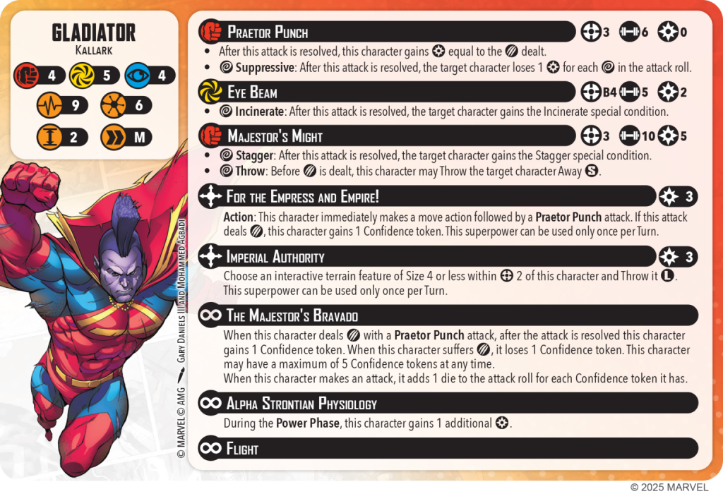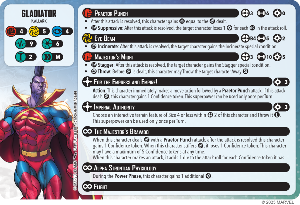 Copyright AMG, MarvelOne of the first things that jumped out to me on the character card are the raw defensive stats that Gladiator has. He has 4-5-4 defenses, which is a solid starting point, and I think is entirely appropriate for a 6 threat character. Also, I was not surprised that he is a 6 threat. I would have been more surprised if Guardian wasn’t a 6 threat. Additionally, he has 9 stamina on both his healthy and injured sides, which is putting him in the Dormammu and Hulk range of stamina. This means he will be able to stick around the table for a little while, even though he will have a HUGE target on his back. More on that in a second, but first let’s take a look at his suite of attack powers. His basic attack is called Praetor Punch, which is a R3, 6-dice builder. I like the range on this attack, and the number of dice seems appropriate given the threat level, and is honestly what I thought the basic strike for Hero Thor should have been changed to. Additionally, for every Wild he rolls with this attack, he drains power from his target, which is always a great effect to have. His next two attacks are where things get amped up quite a bit. For a measly 2 power, his Eye Beam is a R4 Beam with 5 dice and a Wild Incinerate trigger. On the right map layout (see: E maps), this attack can be devastating as you will be able to hit so many targets in one burst. His true spender attack is Majestor’s Might, and I think it will be totally worth it when you get a chance to use it, which I don't think will be very often. It’s R3 (which is fantastic), 10 dice, and costs Gladiator 5 power. Additionally, if you roll a single Wild result (which statistically will happen 78% of the time on 10 dice), your target is now Staggered and being thrown away S before damage is dealt. While there is a set direction for this throw, there is not a size limitation, so Gladiator can throw the biggest models in the game away from R3.