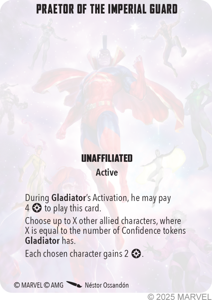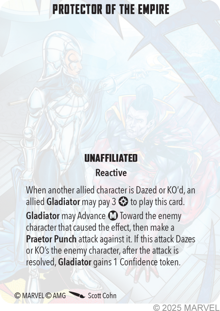 Copyright AMG, MarvelAMG also gave Gladiator two Tactics Cards. The first card, Praetor of the Imperial Guard allows him to really inject some power into the rest of his team. For 4 power, you get to give a number of allies 2 power each. The number of allies you get to affect with this card is determined by the number of Confidence Tokens Gladiator currently has. Protector of the Empire gives Gladiator a charge move if an ally is Dazed or KO’d for 3 power. It is exactly like the charge on his character card, it just gets to happen outside of Gladiator’s activation. I like both of these cards, but like every TTC that gets revealed, whether or not these make it into your 10 or 5 TTC selections is going to really depend on what affiliation you are playing Gladiator in. In a faction like X-Men, for example, that has several cards you want to take every game, it may be more difficult to fit these in, whereas an affiliation with fewer affiliated TTCs may be able to find room for these two cards.