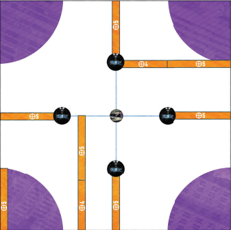 credit: Atomic Mass GamesThe map is split into four deployment zones, with each player choosing a corner of the map to deploy from. Each player may deploy within range 5 of their designated corner, allowing them to get into the thick of it pretty quickly. It's a quarter circle deployment zone, which looks intimidating to set up but is actually quite simple in practice. If you measure from the corner of the battle field with one edge of the range 5 tool, it will give you an idea of where you can place your characters.