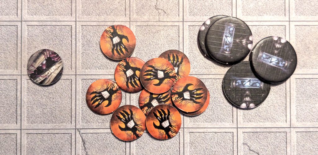 Characters may interact with any of the Canister tokens on the table to draw a card from the Symbiote Deck and give it to the interacting character. If it is a Symbiote card, they must also pick up a Symbiote Token. This interact does not cost power, thanks to the Willing Hosts special rule. In fact, all Interacts are free during this scenario. A character may not hold more than one Symbiote Card and/or Symbiote Token at a time, but it may have a Sonic Rifle as well as a Symbiote Card. If a character would gain a new Symbiote Card during the game, that character must discard one of the two Symbiote Cards at random. This represents the two symbiotes fighting over which of the two will inhabit their host. The discarded card goes into a discard pile next to the Symbiote Deck and if there aren't any cards left in the deck, the discard pile is shuffled to create a new deck.