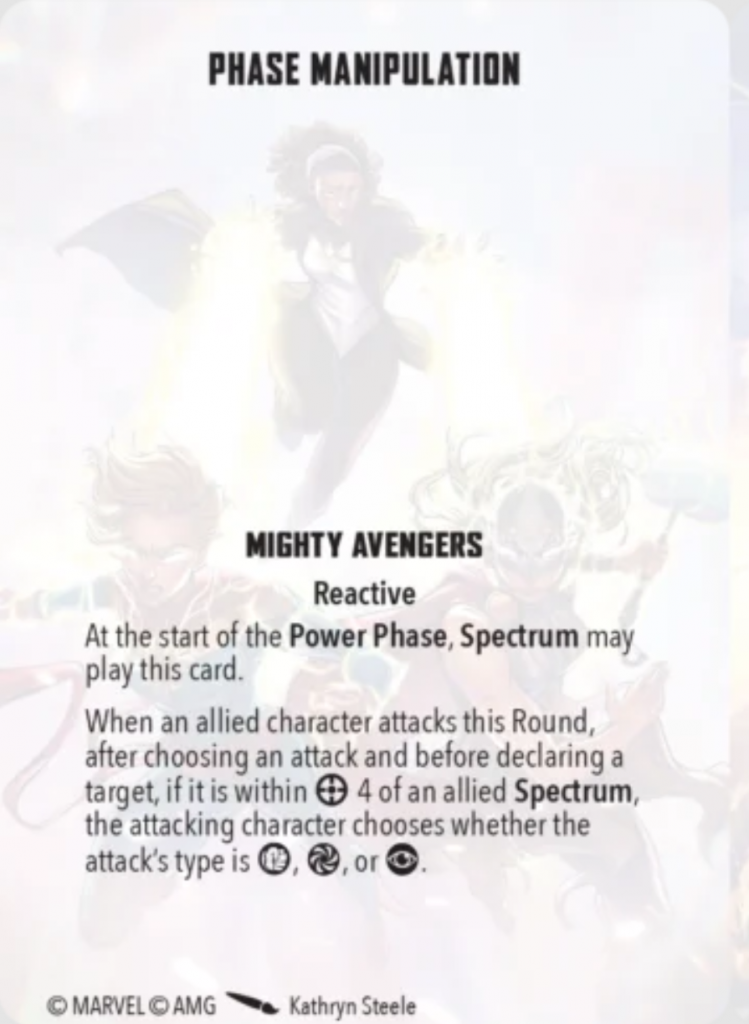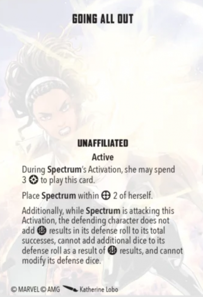 We’ve already covered the fact that Spectrum has no trouble generating power thanks to Photon Blast, so she can easily pay 3 for this.Placing herself within Range 2 means she can line up the perfect beam and then go to town…with some of the best “try and dodge this” tech in the game. Lining up enough people in this beam is going to be devastating for your opponent.