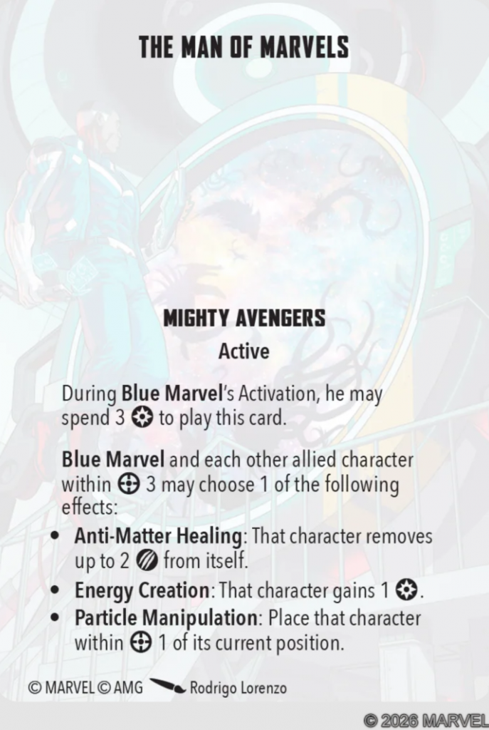 At the time of writing, we are yet to see an Affiliation list. But Atomic Mass Games have hinted towards Captain Marvel, Cosmic Avenger being affiliated - who is a power-trick character through-and-through. So I think there will be a lot of cool tricks packed in with this Affiliation.