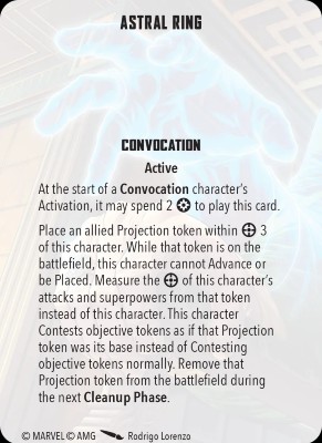Astral Ring is potentially powerful, though it’s a bit niche. Extending the range of attacks and superpowers can be incredibly strong, but remember that it doesn’t get around things like Stealth. It might be taken more if Convocation didn’t have other great cards, but they do, so it’s a bit hard to justify taking in squads.