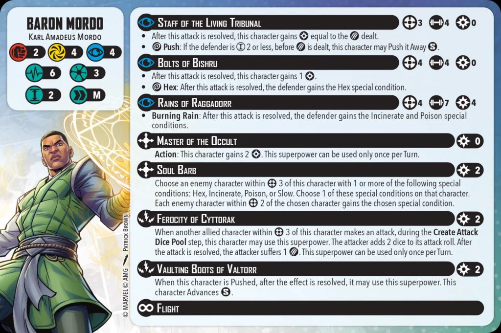 Rounding out Mordo’s kit are some additional utility tools: Vaulting Boots of Valtor lets him scoot around after being hit, and Master of the Occult lets him gain some power for an action. Both are niche but can be nice to have when they’re relevant.
