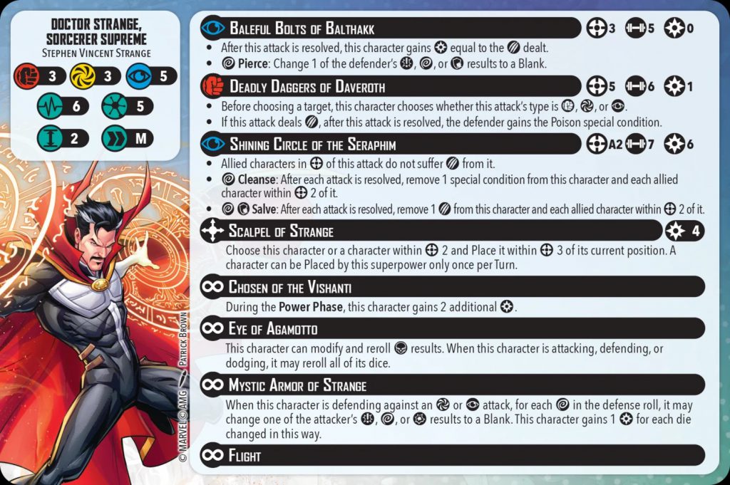 Players may notice that Strange’s defensive stat line of 3-3-5 is pretty poor, but he does have two superpowers (and a Tactics Card) to help with that. Eye of Agamotto lets him reroll all of his dice once per attack, defense, or dodge roll (note: it has to be all the dice, not just the bad results), and Mystic Armor of Strange gives him “reverse pierce” against energy and mystic attacks, changing one die in the attack roll to a blank for each wild result in his block.