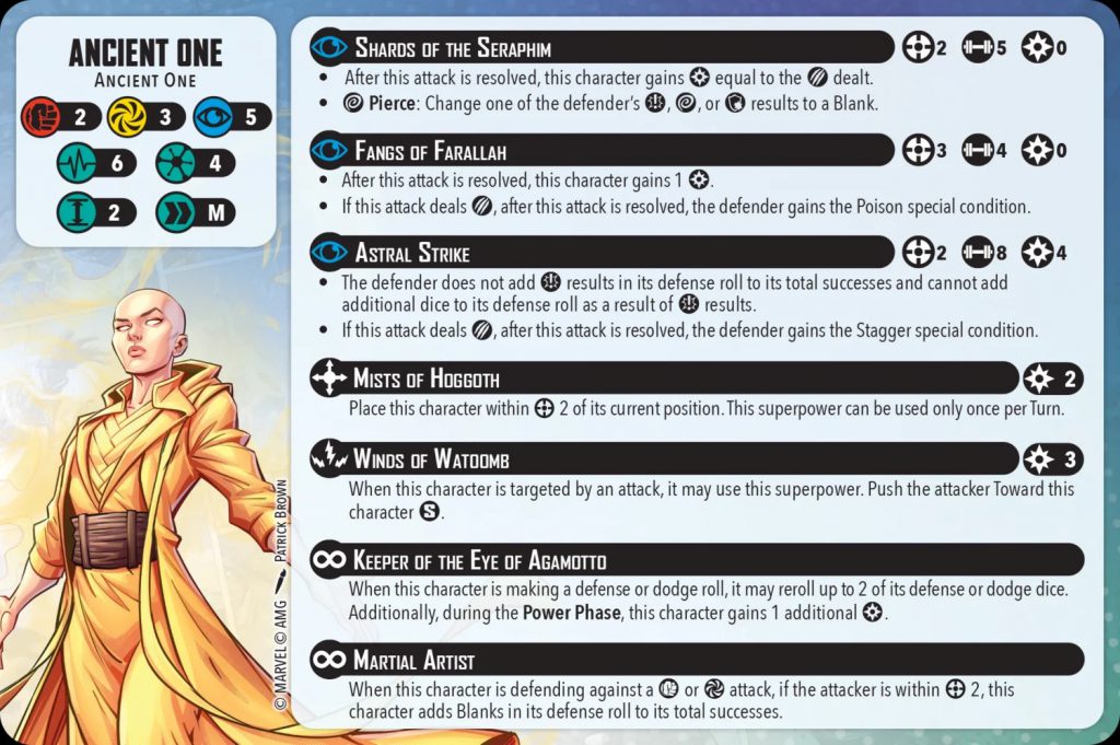 So, Ancient One has some tricks up her sleeve to stay alive, but he also hits hard. Her first free attack, Shard of the Seraphim, is exactly the same as Stranges, delivering 5 Mystic dice with a wild pierce. Astral Strike is scarier, dropping 8 dice for 4 power. However, it’s a little spicy in that defenders don’t get to count or explode crits, and the guaranteed stagger is an excellent bonus if she doesn’t get the daze or KO. She’s also got a range 3, 4 dice attack that can drop poison, but it’s not what players will want to be using unless they’re out of range 2 and she needs the automatic single power gain it provides.