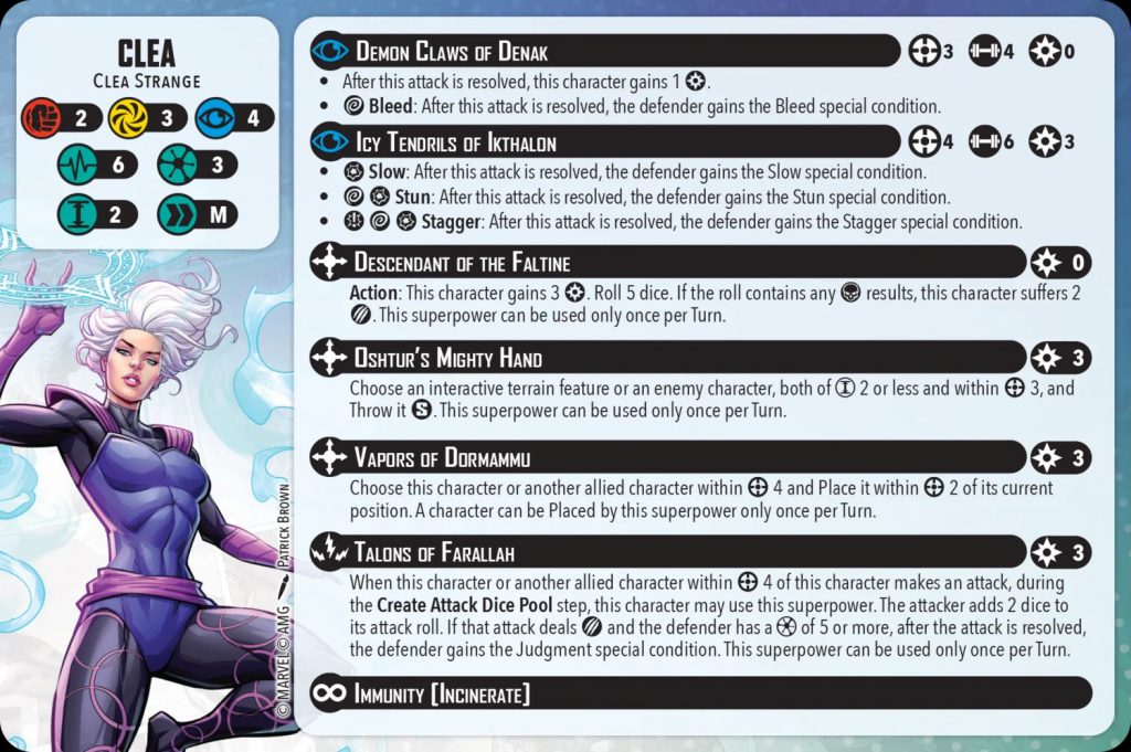 Clea’s attacks are a bit hard to judge because they aren’t the primary reason she’ll hit the table. Demon Claws of Denak is only 4 dice at range 3, so it’s unlikely to do much attrition work, but it grants her a power no matter what and helps fund the cooler things she can do. Icy Tendrils of Ikthalon is potentially quite strong with the ability to Slow, Stun, AND Stagger the target from range 4 if her dice land right, but 3 power is a lot for Clea, who gains it one at a time and has some great superpowers to spend on.