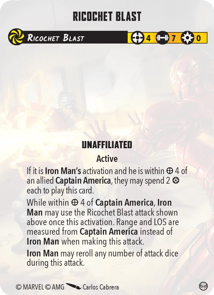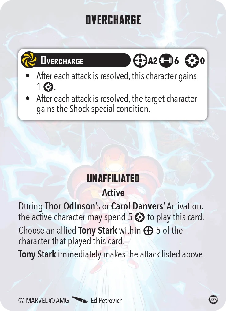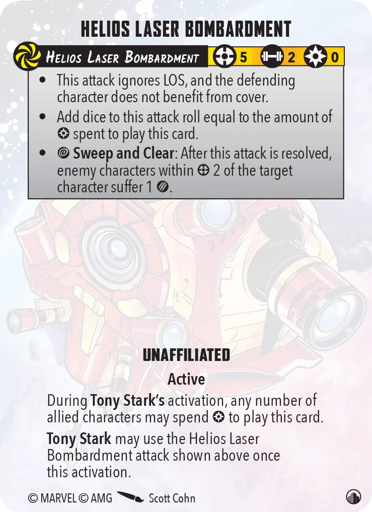 Credit: Atomic Mass GamesThis is a rare ‘free attack’ card. Carol Danvers or Thor Odinson may spend five power during their activation to give Tony Stark a free area attack.