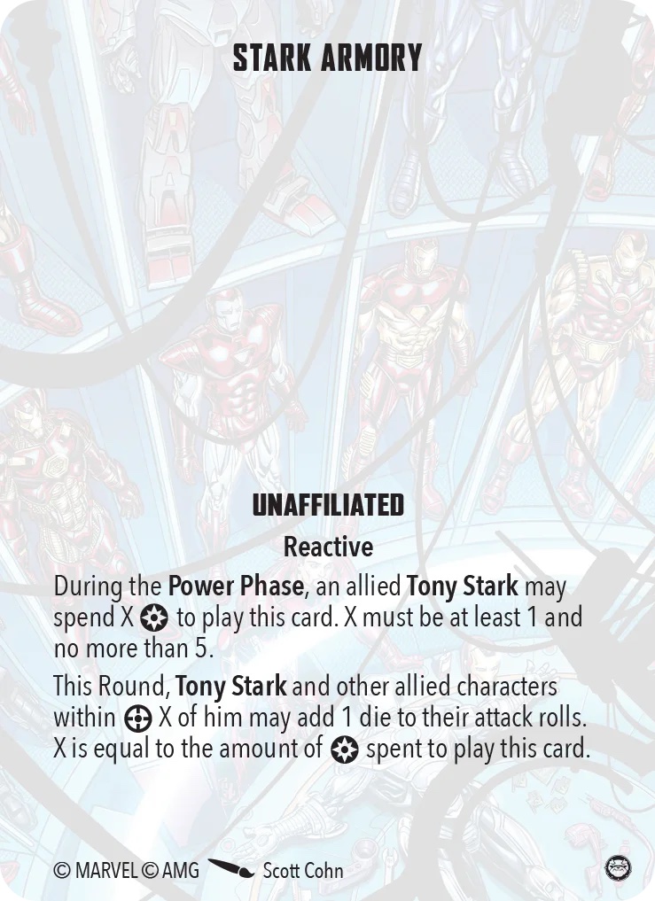 Credit: Atomic Mass GamesOne of the newish additions to Tony Stark’s arsenal is his armory. Adding one die to all allied attacks is great. It’s best when Tony is surrounded by models with Rapid Fire, Beam, or who can otherwise gain additional attacks. The Avengers have myriad candidates: Vision, War Machine, Black Widow, Agent of SHIELD, any Captain with a shield, just to name a few.