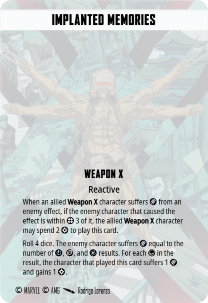 If you put Logan on the table and accept the fact that he is temporary…you’re going to have a great time. I played this guy in the Weapon X affiliation alongside Nebula who has a very similar play pattern and oh my…it was a ton of fun. Having characters that you don’t necessarily care about losing is a big power move, especially when they hit as hard as Weapon X does.