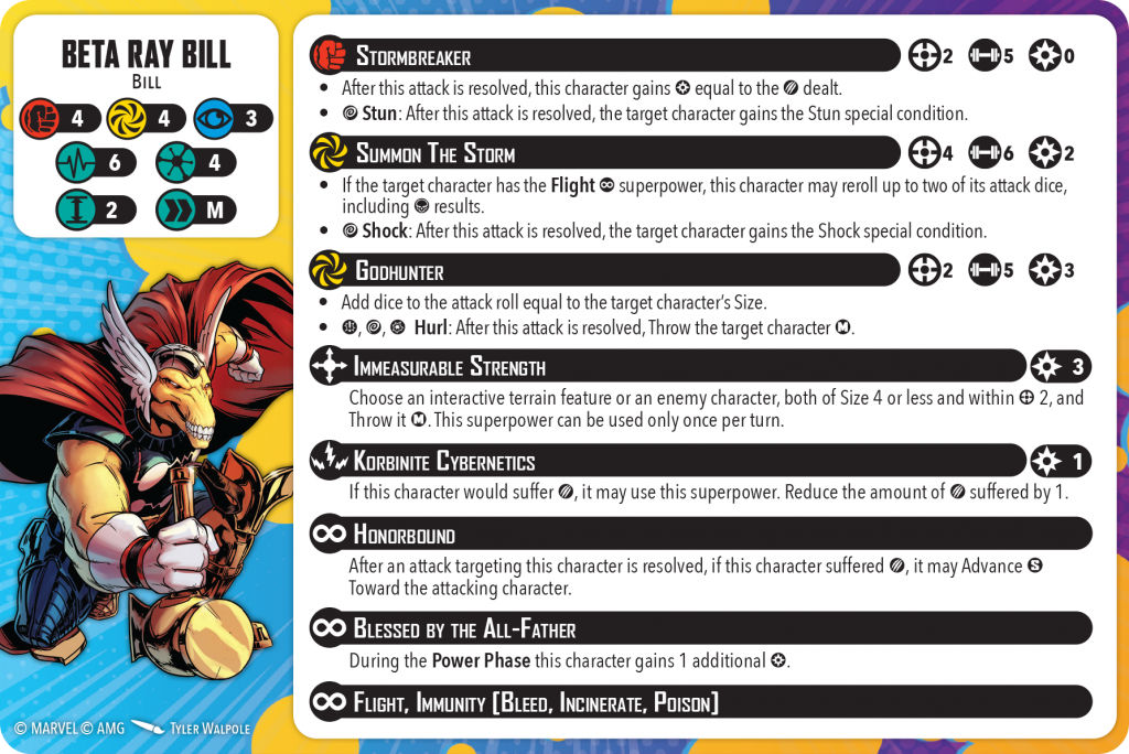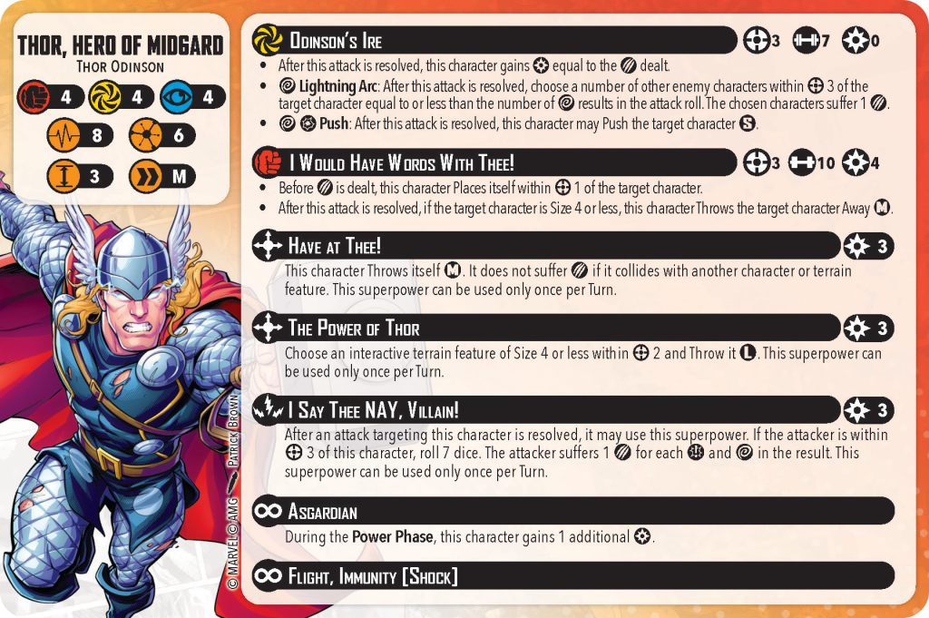 Now, Brothers in Arms stops throws as long as Thor and Bill stay within range two of each other for that round. Still, Thor is size three, so being able to throw him into Loki can be a great way to help get some damage onto Loki. Additionally, throws can’t trigger Oh My, What a Pity.There are a mess of good throws available. Half of the Asgard roster can throw size three or less. Avengers have quite a few character throws that can help get damage through. Just remember that Bill can shrug the damage of being thrown. Getting him out of position and making him spend power can still be worthwhile in many cases.