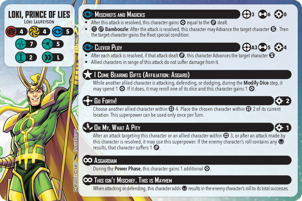 Essentially the team works best when Thor and Bill are within range 3 of Loki, because any time they get attacked, Loki can use his Oh My, What a Pity to punish the opponent for rolling skulls. He can keep gaining power through the leadership as Thor and Bill spend power to reroll a die on any attack and defense rolls.
