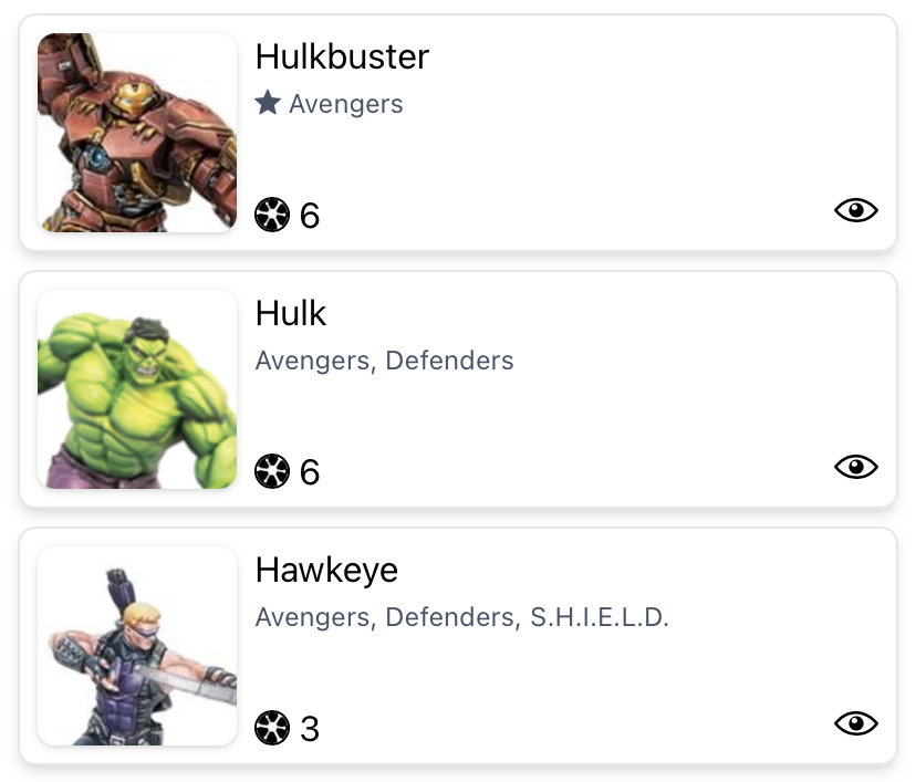 Courtesy of Jarvis' ProtocolI know Hulkbuster isn’t a popular pick, but hear me out! Two big models with big stamina pools that can push and throw Thor and Bill around. Hawkeye is there to back them up with shock and slow in particular, but poison and bleed are nice to have as well. Plus, Hawkeye will get a lot of power (if he doesn’t get smeared across the pavement) to power Helios Laser and/or Patch Up. You should probably take Patch Up because the big risk of this team is that Hulk and Hulkbuster don’t really have an injured side. So a Thor who spikes could deplete their health pools pretty quickly.