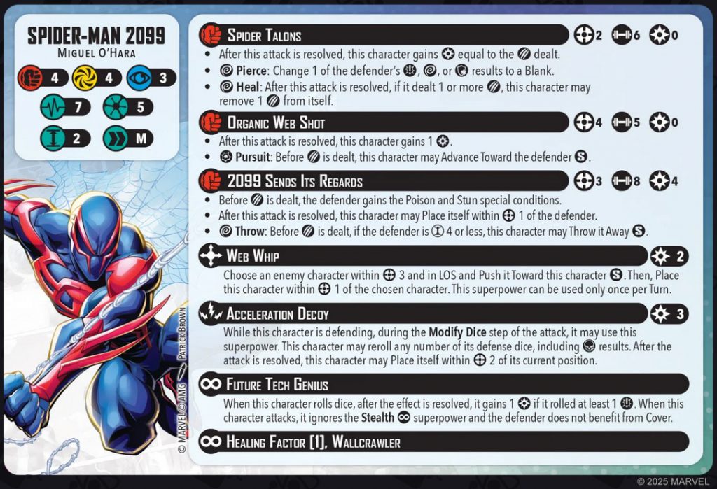 Spider-Man 2099 Character Card. Credit - Atomic Mass GamesSpider-Man 2099 is a 5-threat character with 4/4/3 defenses and 7/6 health. His base stats are a little below the curve defensively for a 5-threat, but the rest of his kit more than makes up for that.