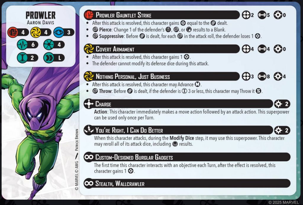 Prowler Character Card. Credit Atomic Mass GamesThe Prowler is a 4-threat character with 4/4/3 defenses, 6 health on both sides of his card, and a long move. In terms of base stats, the long move is a welcome addition—especially when, as we’ll see below, he has the Charge superpower.