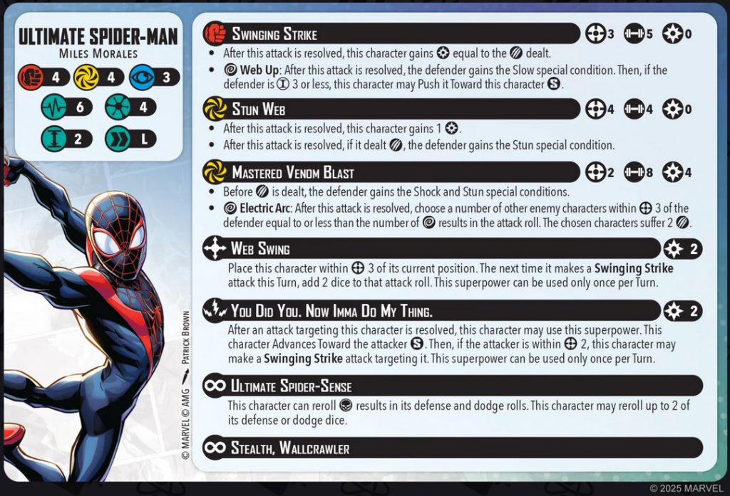 Ultimate Spider-Man Character Card. Credit - Atomic Mass GamesThe Ultimate version of Miles is a 4-threat character with 4/4/3 defenses and a long move. He has 6 health on his healthy side and 5 on his injured. His base stats are already better than his 3-threat counterpart, and the long move combined with Wallcrawler gives him a lot of mobility—which is exactly what the Web Warriors want.