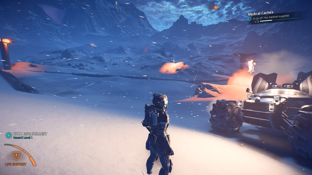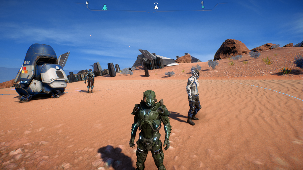 Until the very end of the game, every time you engage in a major plot mission, it is done from one of these big open-world maps -- this is a major change from the latter two games in the Mass Effect trilogy, which spent a lot of time making boutique, one-off facility maps for you to rampage through, like the drifting Reaper space hulk in Mass Effect 2 and the biotic school Jack teaches at in Mass Effect 3. The game ME:A most closely resembles, then, is Mass Effect 1, where you were guaranteed at least once per world to engage in a long, arduous (sometimes in a good way, sometimes bad) trek across the surface of each plot world in the Mako rover to chain together these boutique facility levels. In this sense ME:A is a true inheritor of the very first game of the Mass Effect trilogy, rather than manifesting in the intensely on-rails, sometimes visual-novel style that the latter two games in that series found themselves embodying; that’s not necessarily something everybody wanted to go back to.