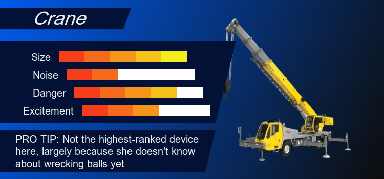 It took me a while to get her to learn what a crane is - I blame Richard Scarry for drawing a million weird ones that aren’t recognizably the same thing - but now she points them out pretty consistently. It’s always fun to watch your kid learn a new skill, and truck phrenology isn’t exactly the most important skill she’s picked up, but it is a skill.