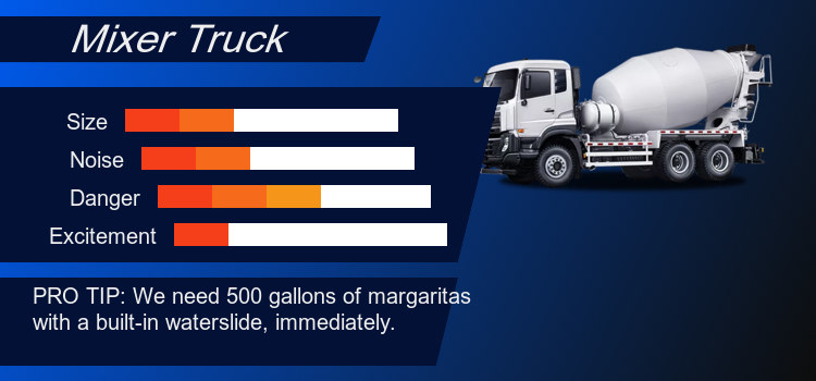 Before you ask, no, she doesn’t know about monster trucks. That is too raw and real to show to a child her age. It would blow her mind, and ruin regular vehicles for her. She’d never be impressed again by even the reddest fire engine or those tractor trailers with like thirty axles. Maybe when she’s four, we can talk about Gravedigger.Mixer Truck