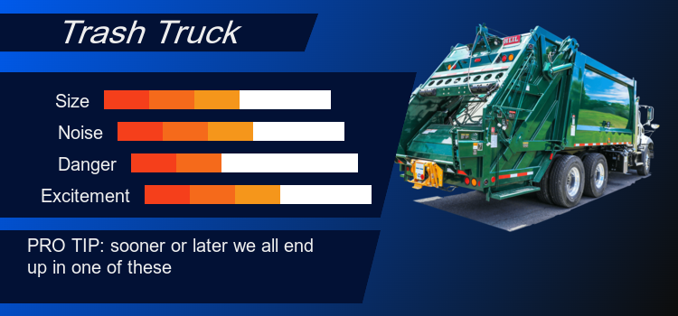 One of the objectively sickest trucks there is, the excavator (or digger truck) combines tank treads with a scary metal claw. It trundles around making holes in stuff like the fist of an angry god. I can imagine, if I were three feet tall and struggled to dig to the bottom of a sandbox, I would also become obsessed with a bathtub-sized scoop ripping up yards wholesale.