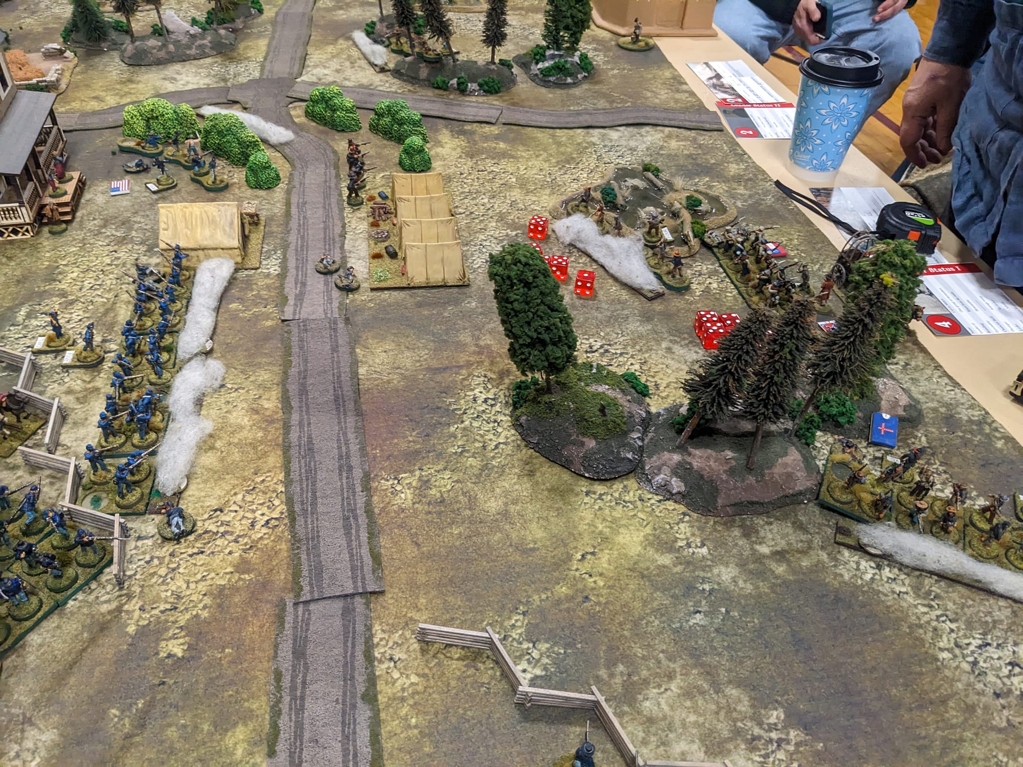 Confederates move down the board. Mugginns' Sharp Practice game at FlintCon.2 .What is your upper limit of the definition of 'historical wargaming'?