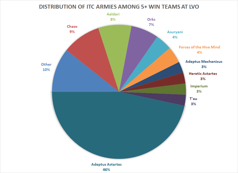 As before, Space Marines dominated the format as a whole, making up more than one in four armies. Coupled with what we’ll see was a tournament-high 61% win rate, this means that your chances of playing a Space Marines player in the tournament each round increased significantly as you won more games. A player who won their first three games had roughly an 80% chance of playing Marines in round 4, and a given player had only a 6% chance to make it through round 4 without playing any Marines after starting 3-0.