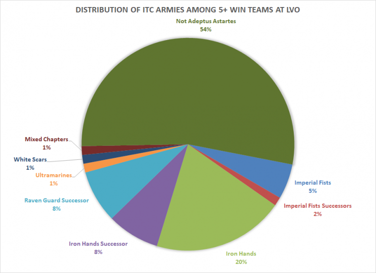 This isn't far off of what we've seen in our recent analyses and of course, this led to a disproportionate number of Marine armies in the top lists. If we refine our sample to just the lists that went 5-1 or better through the event's first two days, we can see this impact immediately, where Adeptus Astartes armies make up a whopping 46 percent of the 5+ win factions. And true to form, they'd eventually account for five of the top 8 lists on the final day.