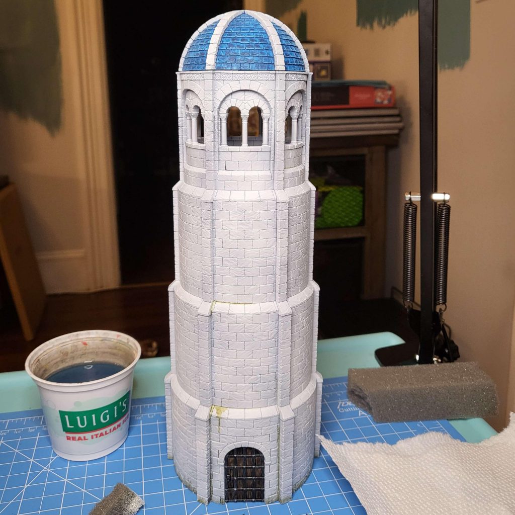 The tower after acrylics.Adding some shade to the recesses of the tower with not only make the sculpted details pop, but it will also make the mottled stone effects stand if (if you have chosen to go that route. You could achieve this a few ways - by creating a dark brown oil wash, using an enamel panel liner, or with our good pal streaking grime. I went for the last option, liberally brushing on grime and letting it dry. Cleanup was done in three passes with thinner - a first run with paper towels and then two sweeps with makeup sponges.