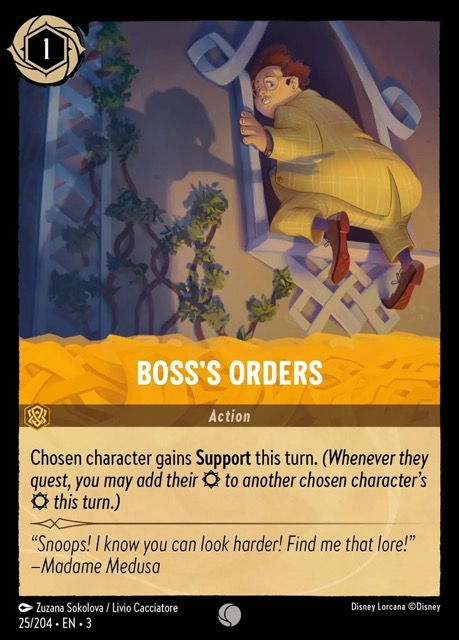 It’s a boring card that has a boring illustration. As much as I love Mulan and all the often-incredible Mulan imagery throughout the game, this one lands as something of a dud. I do like that it maintains that purple is the primary color (you have noticed that throughout all the cards, haven’t you?) and compositionally it’s fine, but the image just makes me sleepy when I see it. Which is almost never, because no one seems to play this card.