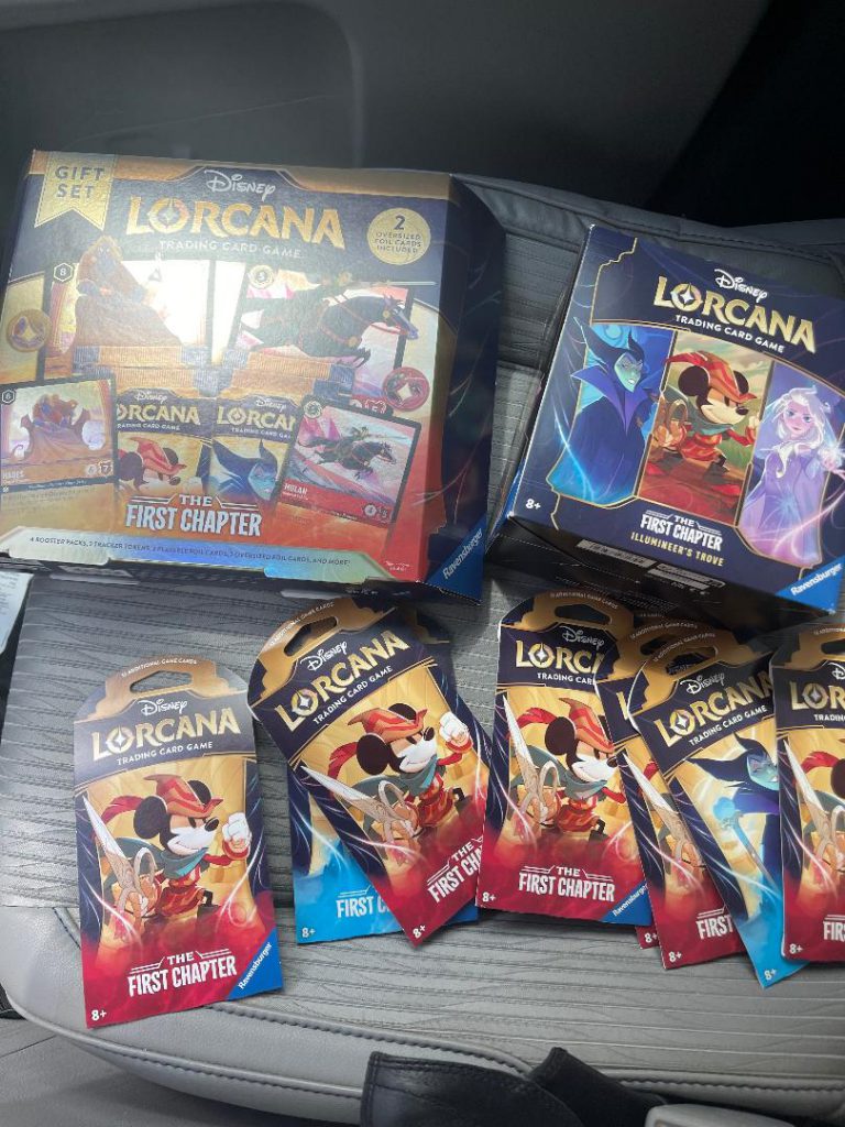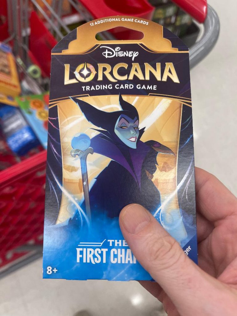 To the sound of a phantom calliope, we approach the trading card section, as we had something like eight times across eight different stores earlier in the day. I’m relieved that there aren’t any middle aged “baseball card dudes” sniffing around, I had already had an unpleasant exchange with one earlier in the day, when he asked me if I was trying to buy Lorcana. He offered me starter packs that he had in his car. $35 per. 200 percent of retail price. It was almost like this scalper was staking out the cards and waiting for potential buyers, which he may have been. Some of these unscrupulous scoundrels have gone so far as to put air tags on the vehicles of distributor representatives to track them as they do their stocking rounds. I declined the offer. I said “well, I hope you enjoy playing the game” as I walked off. I knew full well this guy didn’t know the Duke of Weselton from Flynn Ryder.