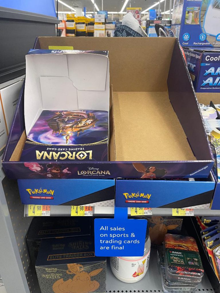 Many held out hope for the subsequent wide release, where big box stores would get product in stock but this was a mess too—primarily because of how TCGs are distributed by third party companies to Target and other retailers. An independent rep (Excell for Target, MJ Holdings for Wal- Mart) goes around to stores and stocks the shelves, usually with little to no regard for street date and often these folks are in cahoots with scalpers looking to beat the public to the product. There are numerous anecdotal reports where scalpers paid off distributor reps to buy out the stock before it touched store shelves. I have yet to see a single piece of Lorcana product at a Wal-Mart, Gamestop, Best Buy, or Barnes and Noble- all listed retailers.
