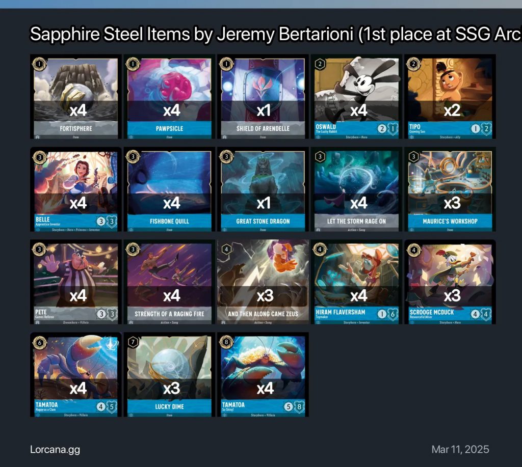 By way of example, here is a Sapphire Steel item deck build that won a high profile release event at South Side Gaming over 138 competitors- this was the first event where Archazia’s Island was legal. The deck was created and piloted by Jeremy Bertarioni, who seems to have this new Sapphire Steel meta on lock: