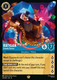 With all these new ramp cards in this rotation, we gotta have something big and gnarly to throw down unexpectedly as a middle game closer. This take on The Great Mouse Detective’s big bad is exactly that. A whopping 8 ink, questing at 4 and virtually unkillable in a standard challenge. And this jerk is Warded to boot. There is a catch- he self-banishes if you don’t ink on your turn, which could be a little tricky if you are card-poor from ramping. But like all of the Sapphire “oh look, I win” cards, it’s one that will assure a dramatic finish when you pull it off.