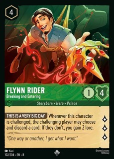 Ah ha! So those Illumineers (Jimothy, Sadako, and Hobie?) did bring on the absolute hero of Disney Lorcana. And you know what this card is maybe actually pretty great and not just here because of my Flynn Rider obsession. This is a Very Big Day is full of promise, and I love that it plays like an update of the original Flynn Rider way back in the First Chapter. When this mad lad is challenged- very likely seeing as he’s a 3-lore quester- the opponent gets to make that awful choice of a discard or allowing you to gain 2 lore. That’s a 5 lore play for 4 ink. And, he’s got a 4 willpower which puts him out of range of a lot of direct removal.