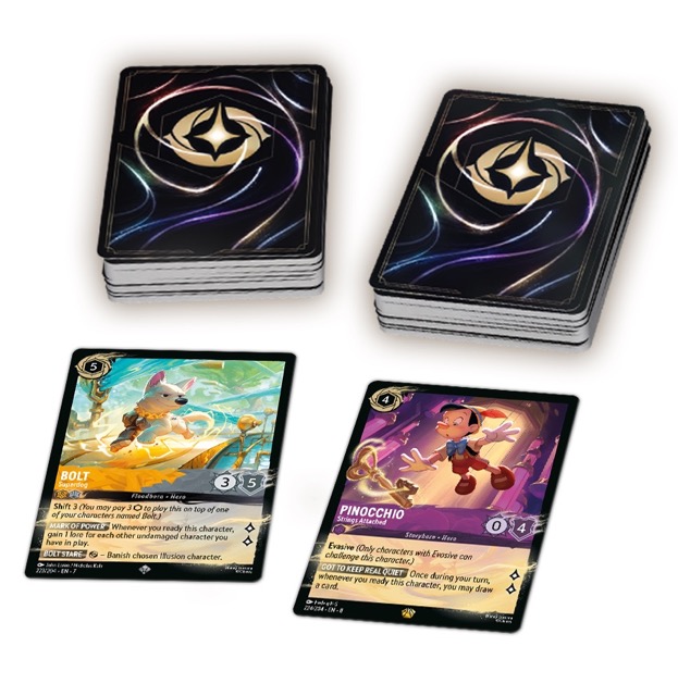 The decks included are serviceable for the first two levels, but at the higher difficulty I think you’d get better results with decks custom made to take on Jafar- the rulebook states as much. This is fine, I guess, but it also means that it’s not really a self-contained game and the advanced difficulties feel like a come-on to buy more cards. And frankly, Disney fans will likely want to because the characters represented here are really kind of un-compelling despite the really awesome Goofy and Pinocchio foils that are exclusive to this set. The Amethyst Sapphire deck is heavily Frozen-themed and leans on a lot of Anna/Elsa synergy and powerful Floodborn plays aided by some ramping. Amber Steel will be a delight for Bolt and Stitch fans, with a support and challenge focused build. Neither deck is what I would call competitive outside of this specific box, and there’s not much exciting if you already have a large Reign of Jafar collection.