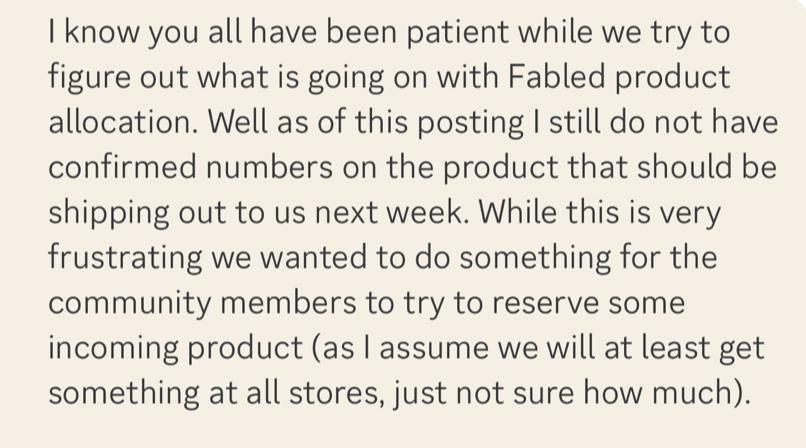 It does make me wonder if this eleventh hour “whoops, not enough product” fiasco is a play to avoid mountains of Fabled sitting on store shelves release weekend. Undoubtedly Ravensburger has taken note of comments online and at events, and preordering up until this allocation shortage was pretty much open season. It’s not a good look if this set doesn’t sell out as soon as it drops. If I walk in to buy a TCG and it seems like no one is buying it and the new release looks like dead stock, that’s a dead game to me. If I have to go to three stores to scrounge up five booster packs and then I’m battling FOMO over paying scalper prices for a box- that’s a game that is viable, current, and I’ll have no trouble finding someone to play with.