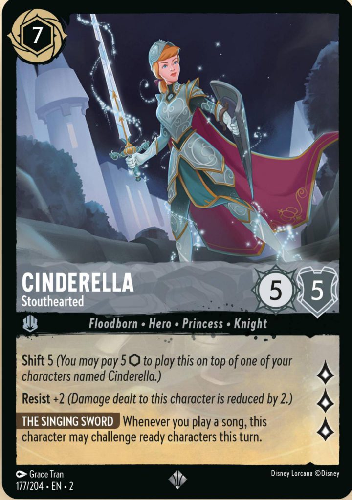 Cinderella, Stouthearted – Resist is one of the set’s new mechanics and nobody does it better than this armored-up princess tank. There’s a great shift target in Steel for her (Cinderella, Knight in Training) but once she’s out, she can be quite tough to take down as she soaks +2 damage. Plus, readied character’s aren’t safe- when a song is played, she can attack them, making her a great removal option in Steelsong. She’s also just a really cool concept, and I love how there’s a Fairy Godmother armorer that synchs up with her over in Amethyst.