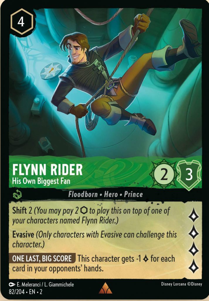Flynn Rider, His Own Biggest Fan – My absolute favorite Lorcana card. I am big into the discard deck archetype, and this is the coolest card to make the most of that strategy. He shifts easily onto the 1 or 2 drop Flynns. He has four printed Lore but loses one for each card in the opponent’s hand. So you run their hand out with Hypnotizes and Sudden Chills, and by then you have one or two Flynns questing for four each. And – get this – this bastard is Evasive too. It takes some setup, but it’s oh so satisfying to pilot through a losing 10-0 game that suddenly finds you at lethal in two turns.