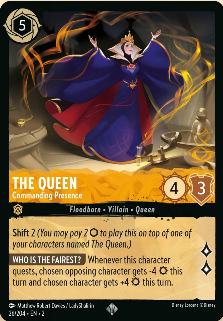 The Queen, Commanding Presence – a starter deck card that was commanding $30 and up before general release, her majesty is unusually hard-hitting for Amber. She can hit the table on turn 2, shifting onto a 1-drop The Queen, Regal Monarch. From there on she is an absolute menace, granting another character +4 strength and reducing an opposing character’s strength by 2. Suddenly Lilo, Making a Wish becomes a deadly threat. And The Queen herself is 4/3, exerting very strong early game board control.