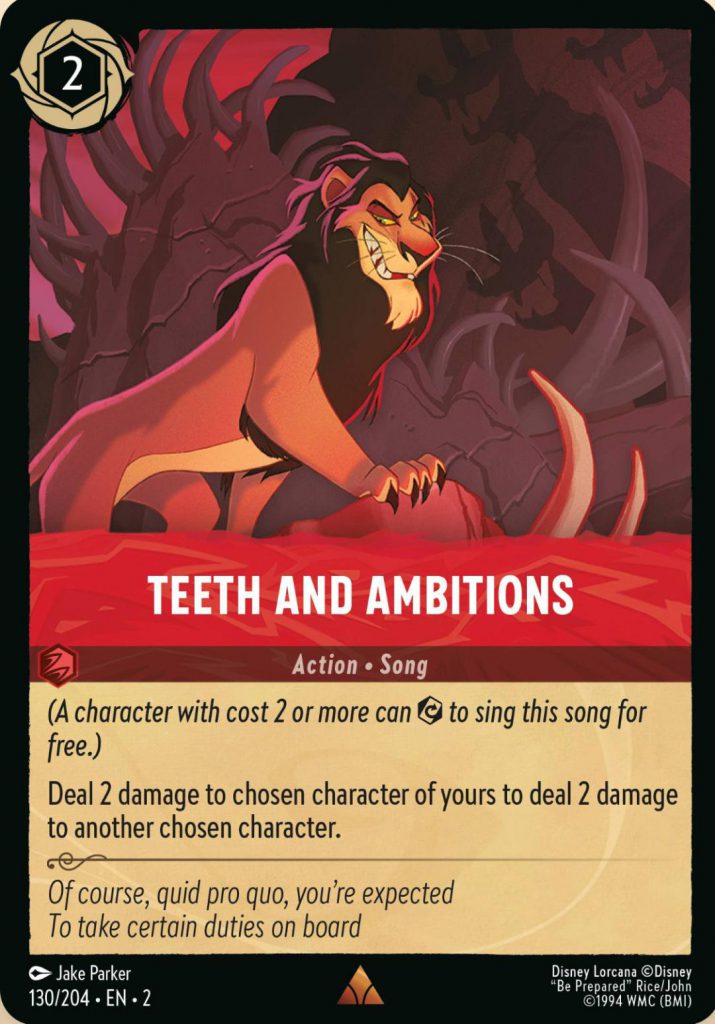 Teeth and Ambitions - One of the more technical cards coming out of Ruby, this is a utility play and a good example of a more advanced card that many might overlook or deliberately ignore. It’s a 2-cost song, meaning it plays early, and it does two damage to an opposing character and two to one of yours. This may appear to be a bad trade-off, but it’s cheap (free if you sing it) and it can set up a Rapunzel, Gifted with Healing for card draw or put some lore onto Donald Duck, Not Again. Or you can just eat the damage with one of Ruby’s many high willpower characters.Rise of the Flodborn has turned out to be a very compelling set- and the meta continues to evolve. Ask any player and they very likely might provide an entirely different list of "best" cards in the set. Right now everybody is all about the whole Mufasa High Roller thing and it’s great except that I didn’t buy a playset back when nobody cared about Mufasa and they were like $3 rares. I’m finding that my discard deck holds it own in the meta and I’m anxious to see what Into the Inklands is going to bring to the table.