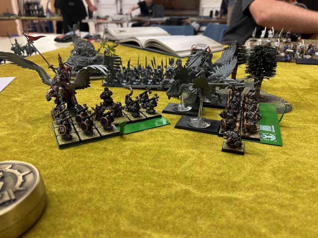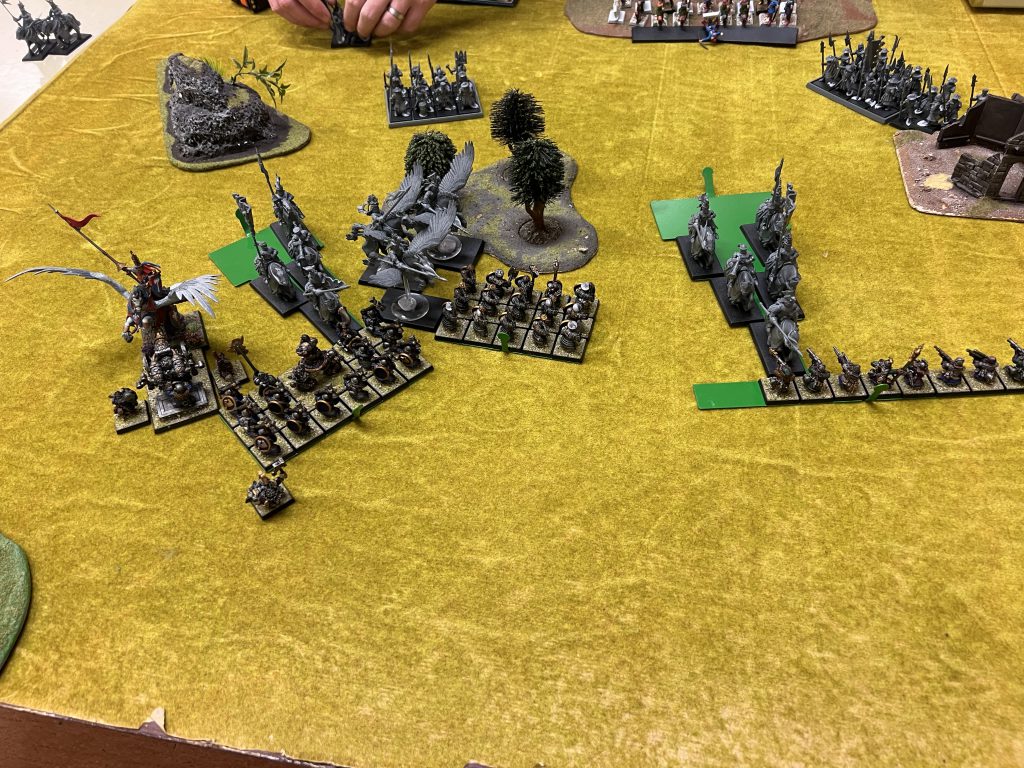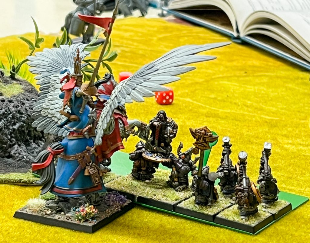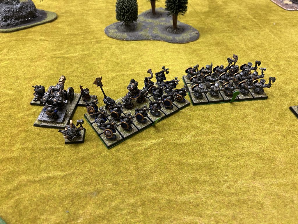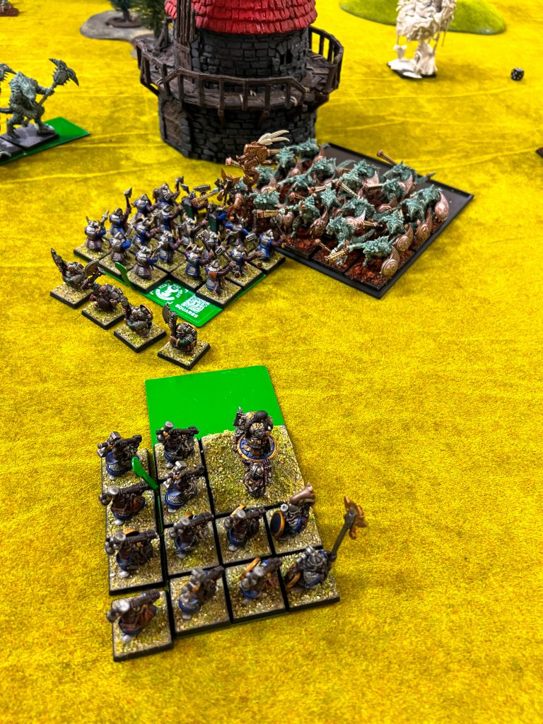 5 skirmishing Rangers find safety fleeing behind a brick of dwarf warriors....don't mind the kroxigors coming in from the flank!