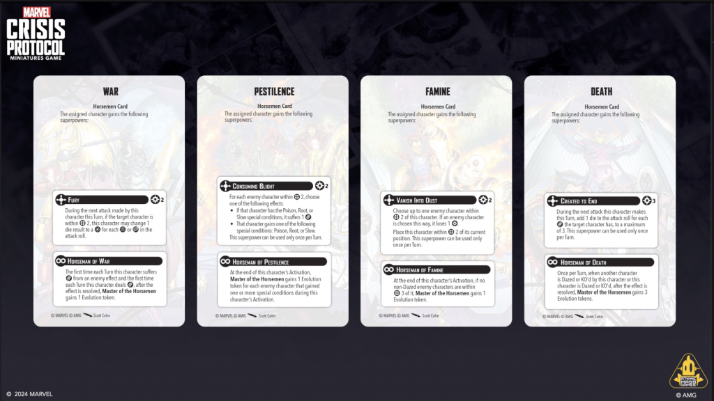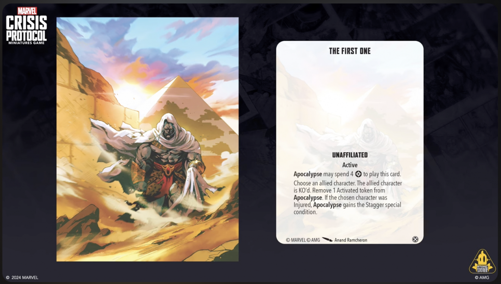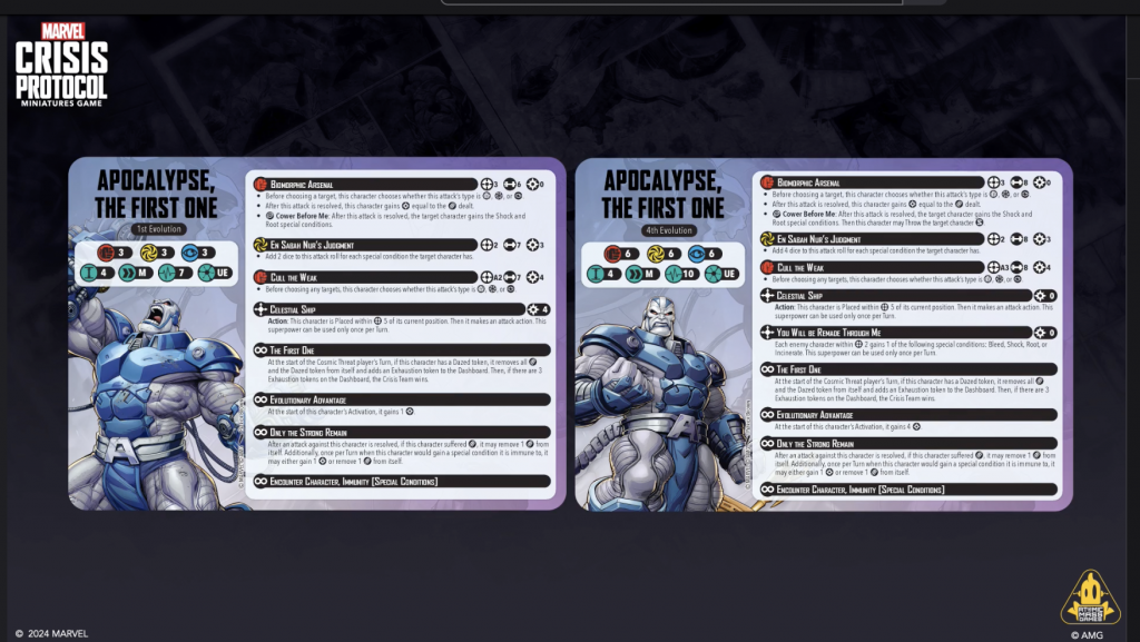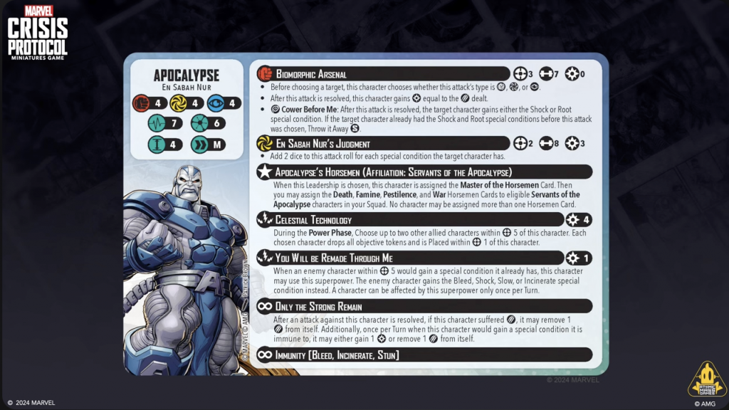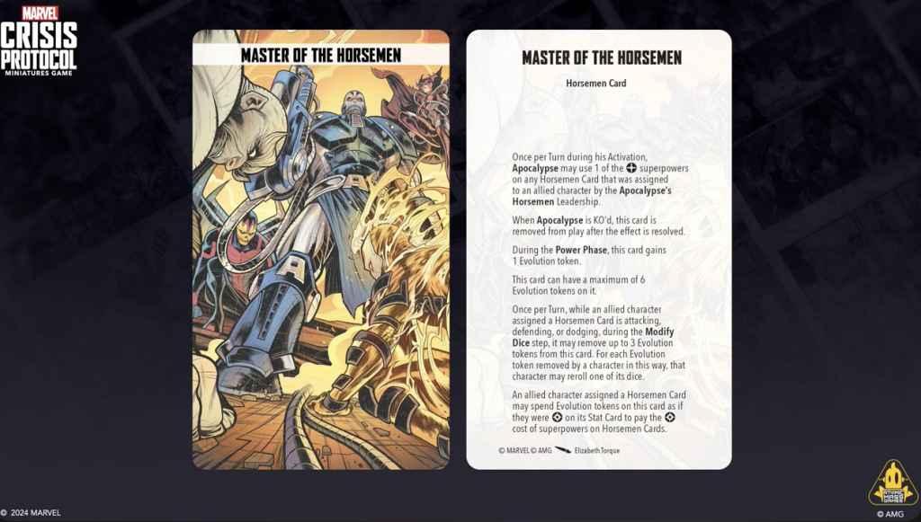 Copyright AMG, MarvelThis was the big one of Day 1 for MCP. Both Will Pagani and Will Schick teased in an episode of the Strike Better podcast that they were going to reveal a ton of information about Apocalypse, and boy did they deliver. Apocalypse will have his own affiliation (Servants of Apocalypse), and a unique mechanic (Master of the Horsemen) that goes along with his leadership with his Four Horsemen. They also revealed and discussed the new Ultimate Encounter that will come with Apocalypse.