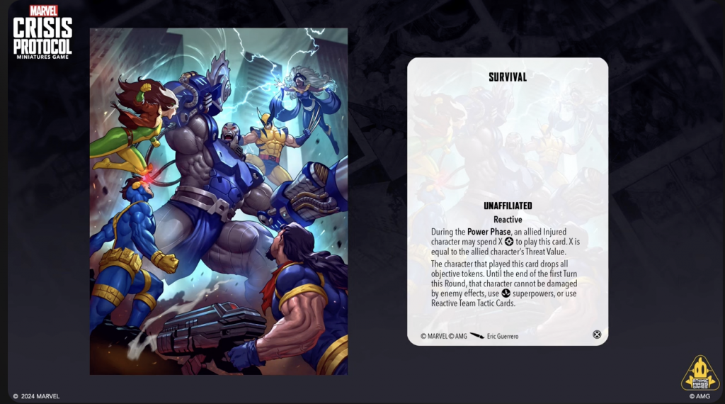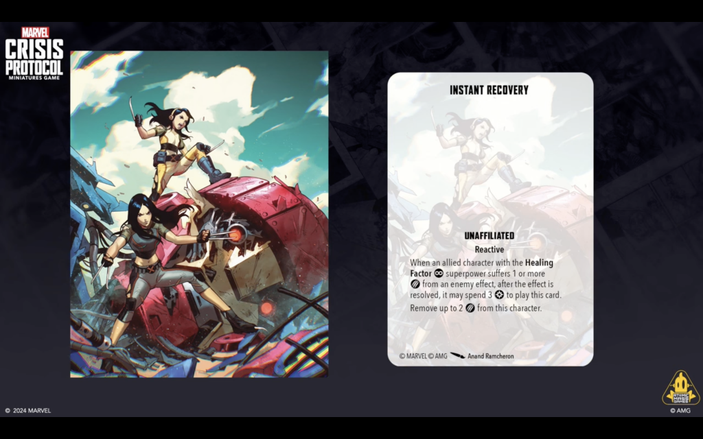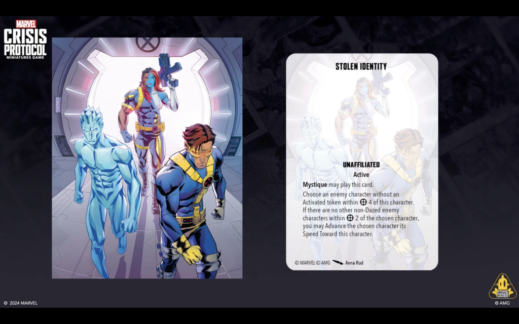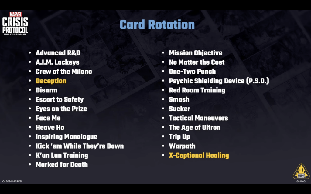 Copyright AMG, MarvelThis will probably be the biggest news from this panel. AMG has released a new list of TTCs that are being rotated out of the game. They did make sure to point out that rotation did not mean they would never come back to the game, which is the case if a card is banned. Some staple TTCs like Eyes on the Prize, Mission Objective, Marked For Death among others are on the list. Additionally, they announced a complete re-working of Mystique’s TTC Deception as well as X-Ceptional Healing. These are now Stolen Identity and Instant Recovery, respectively, and are available to print and play with immediately from here.