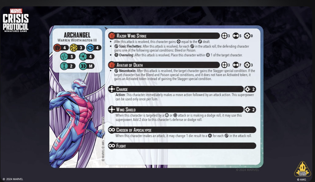 Copyright AMG, MarvelThe panel revealed the healthy side of one of Apocalypse’s more famous horsemen: Archangel. He looks like a fun way to hand out conditions and activated tokens to opponents.