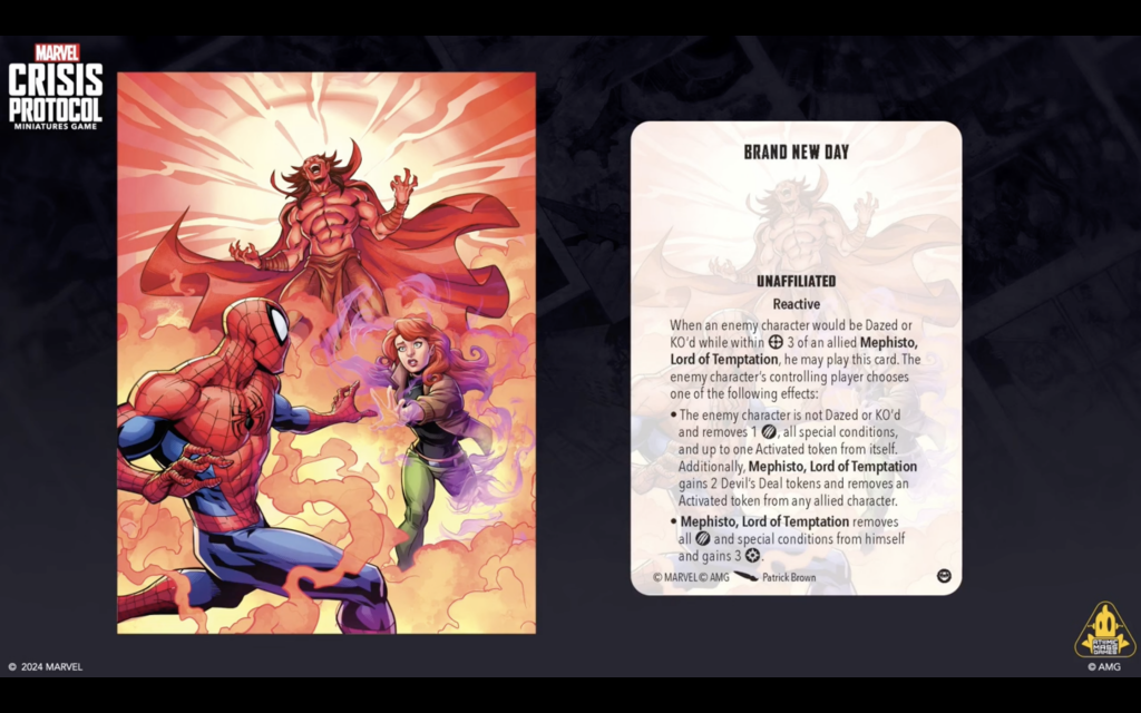 Copyright AMG, MarvelThe cards Embrace the Inferno and Brand New Day were revealed for the unreleased character Mephisto. After seeing these cards, I am really interested in Mephisto and how he will impact the game when he is released. I love how they’ve incorporated the character into these cards.