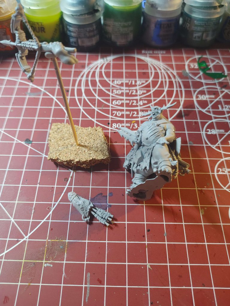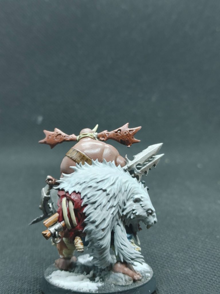 To start, I based coat the model Vallejo Gray Spray which helps get the first layer down for the bear fur as the wrapping on the body. The fur was washed with Soulblight Grey and then drybrushed Corax White while the teeth received a simple coat of Ushabti Bone. The metals were a simple coat of Iron Hands Steel followed by a washed with Nuln Oil, and the straps/wraps were painted either Krieg khaki/Ushabti Bone and washed with Reikland Fleshshade followed by a light Ushabti Bone drybrush.